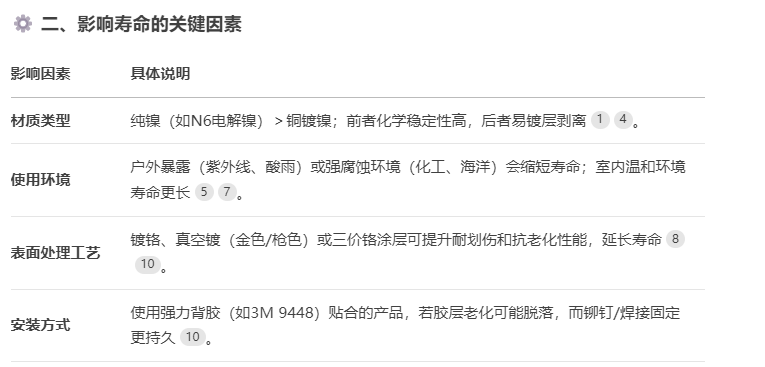 優(yōu)先選擇≥99%純鎳材質(zhì) + 表面鍍鉻/真空鍍工藝 + 強(qiáng)力背膠或機(jī)械固定,以最大化耐久性。